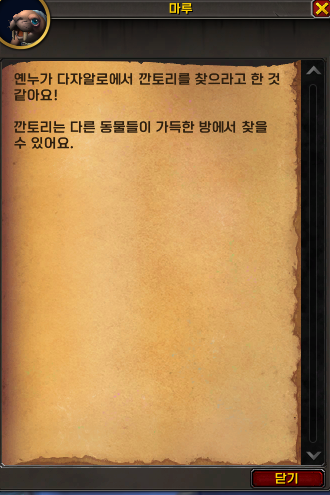 다자알로의 여관 주인들에게 물어 다른 동물들이 가득한 방을 찾고 그곳에서 깐토리를 찾으면 될 거 같아요.